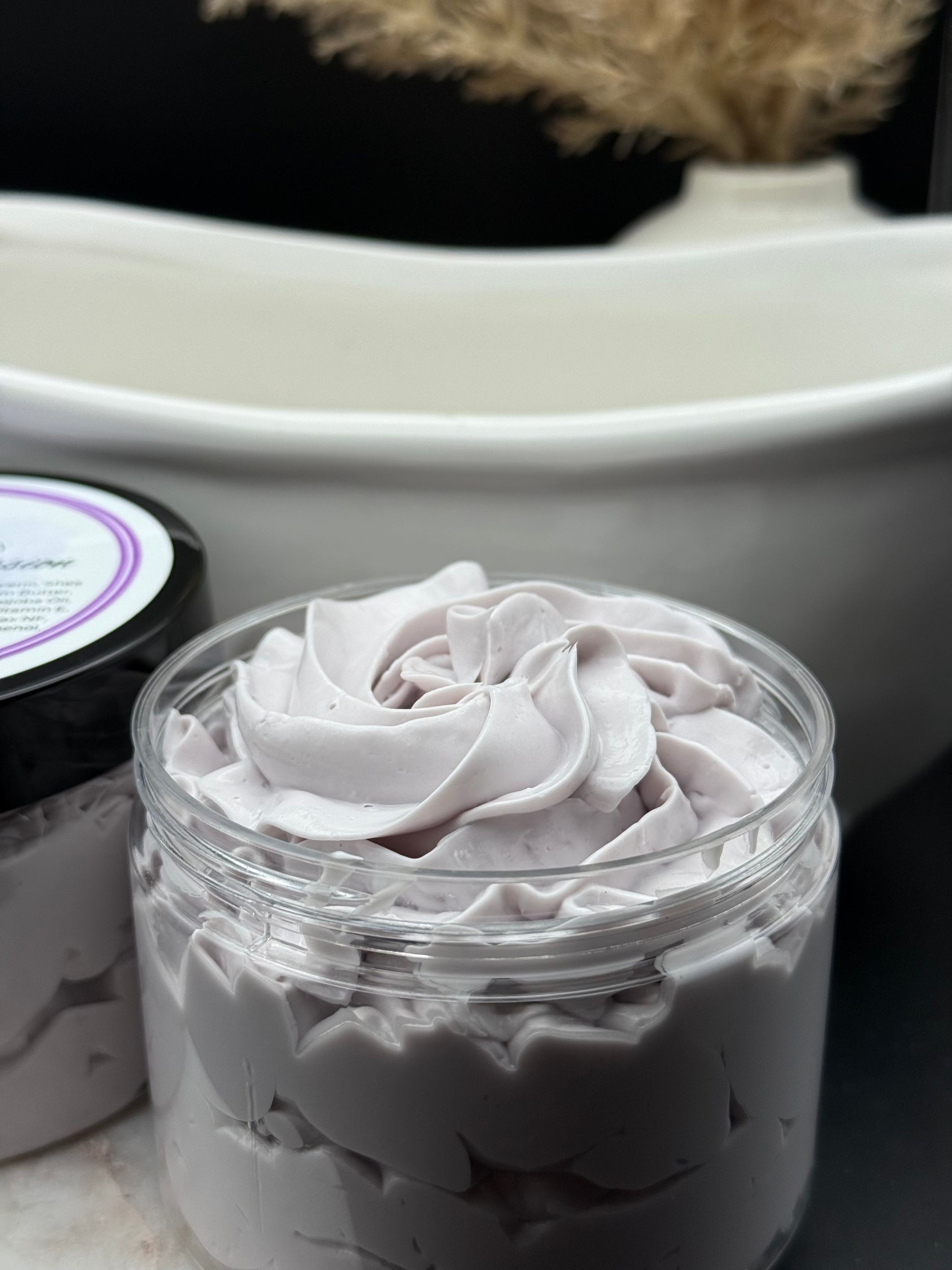 Ingredients: Distilled water, Organic aloe Vera, Glycerin, Organic Shea butter, Organic cocoa butter, Organic mango butter, Organic Kokum butter, Organic Marula oil, Organic Rosehip oil, Organic Camellia oil, Organic Sweet Almond oil, Organic Safflower oil, Organic Jojoba oil, Organic Manuka Honey, Organic vitamin E, vitamin A, Panthenol B5, Organic Colloidal Oats, Organic cetyl alcohol, Organic emulsifying wax NF, Organic BTMS-50, Preservative, Fragrance, Skin Safe mica