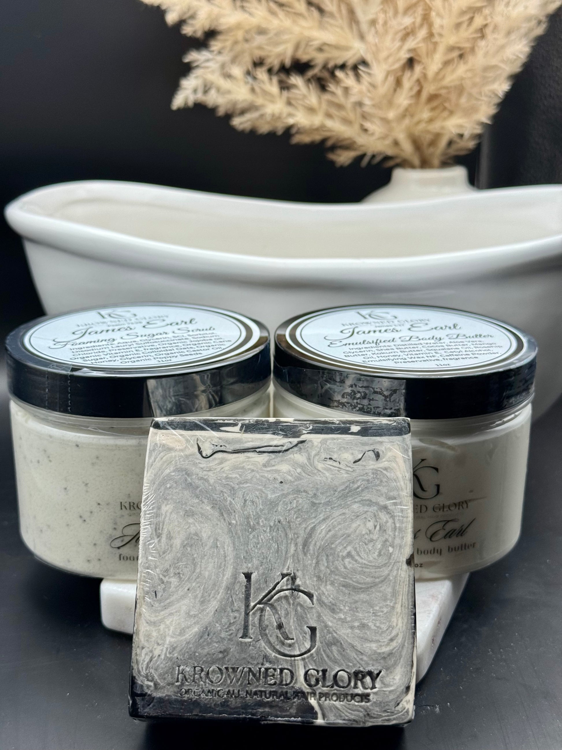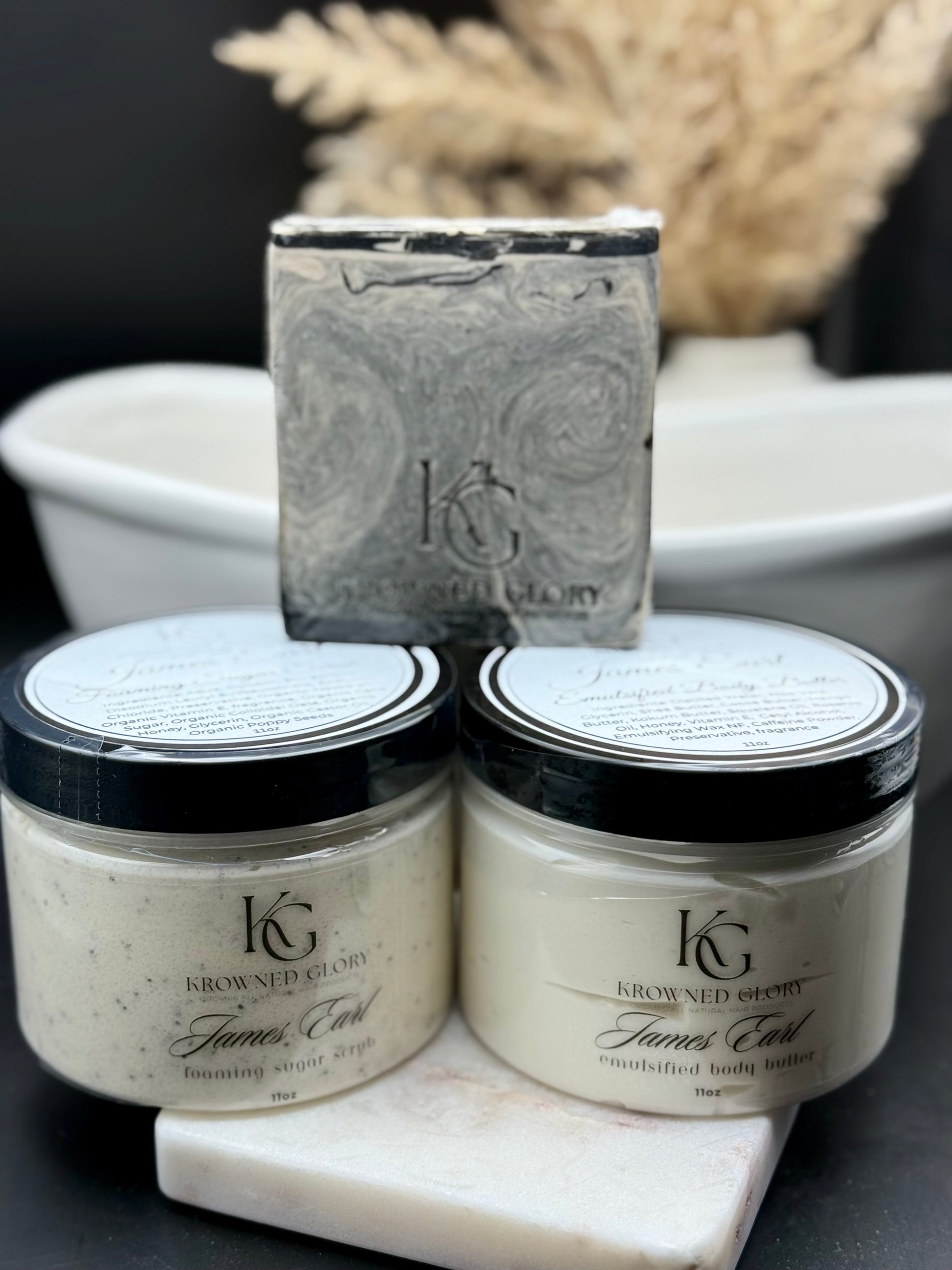 Make your skin a statement with the James Earl Men’s Body Bundle Collection- a premium grooming bundle designed for the man who moves with confidence and leads with quiet power. This three-piece set includes our skin-purifying bar soap, deep-cleaning foaming sugar scrub, and ultra-smooth emulsified body butter, all enriched with high-performing organic ingredients and finished with a warm, masculine vanilla bourbon fragrance.