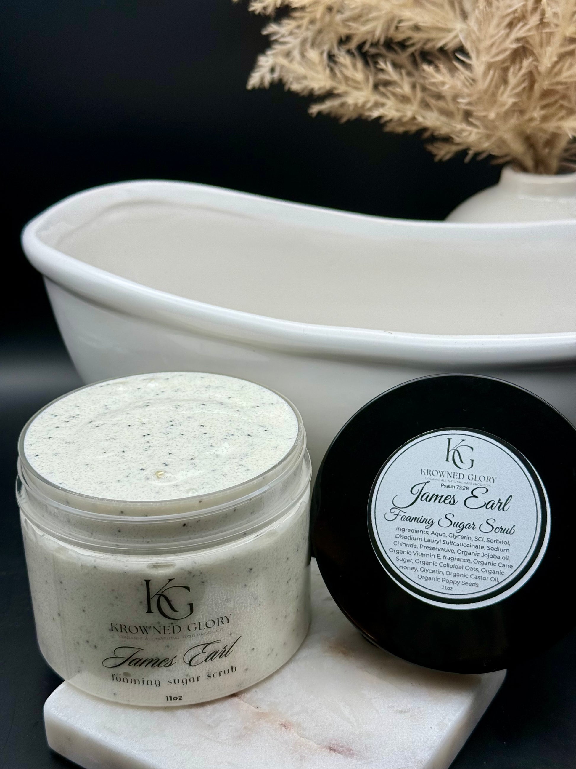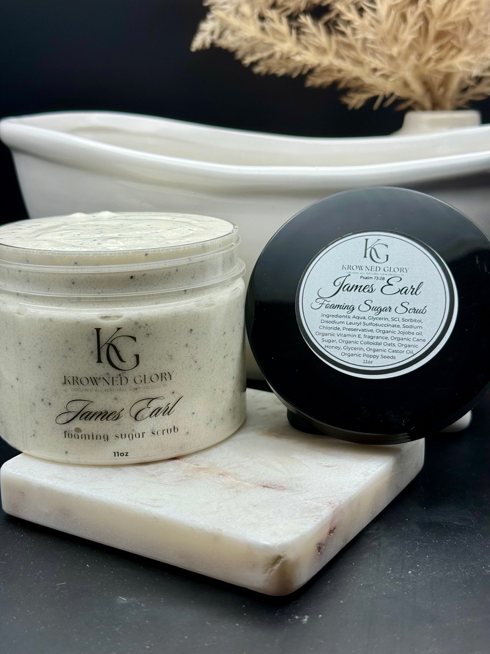 Step into sophistication with our James Earl Men Foaming Sugar Scrub- a luxurious exfoliating experience for the man who appreciates richness, warmth, and quality. Crafted with skin-loving organic ingredients and a smooth vanilla bourbon scent, this scrub delivers the perfect blend of gentle exfoliation, deep hydration, and indulgent self-care.