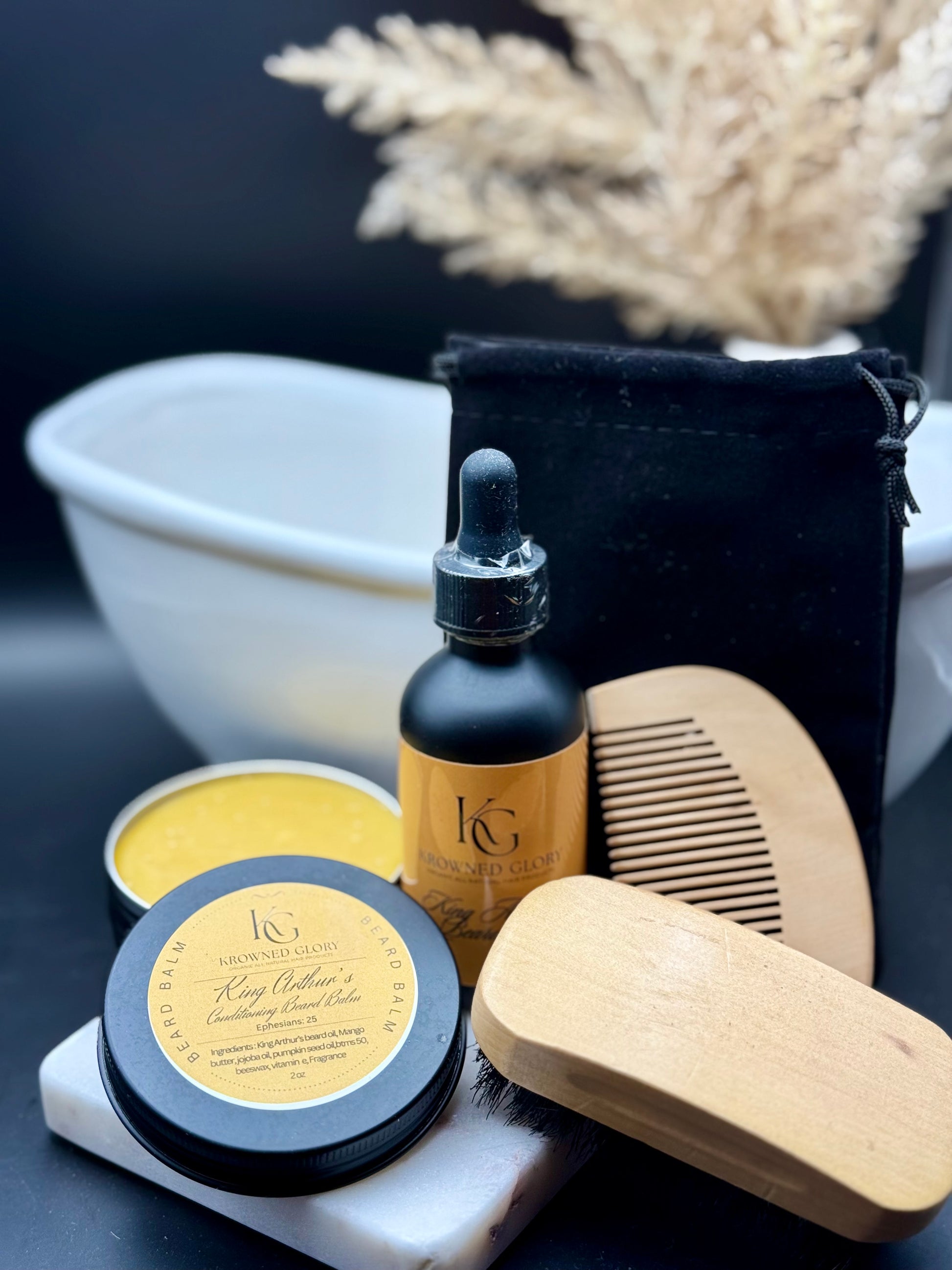 Step into Your power with the King Arthur’s Conditioning Beard Collection- an elite, all-in-one grooming bundle crafted for kings who demand excellence. Featuring our premium Organic Beard Oil and Conditioning Beard Balm, paired with a high-quality beard brush, comb, and a velvet grooming bag, this set is your complete arsenal for beard mastery.