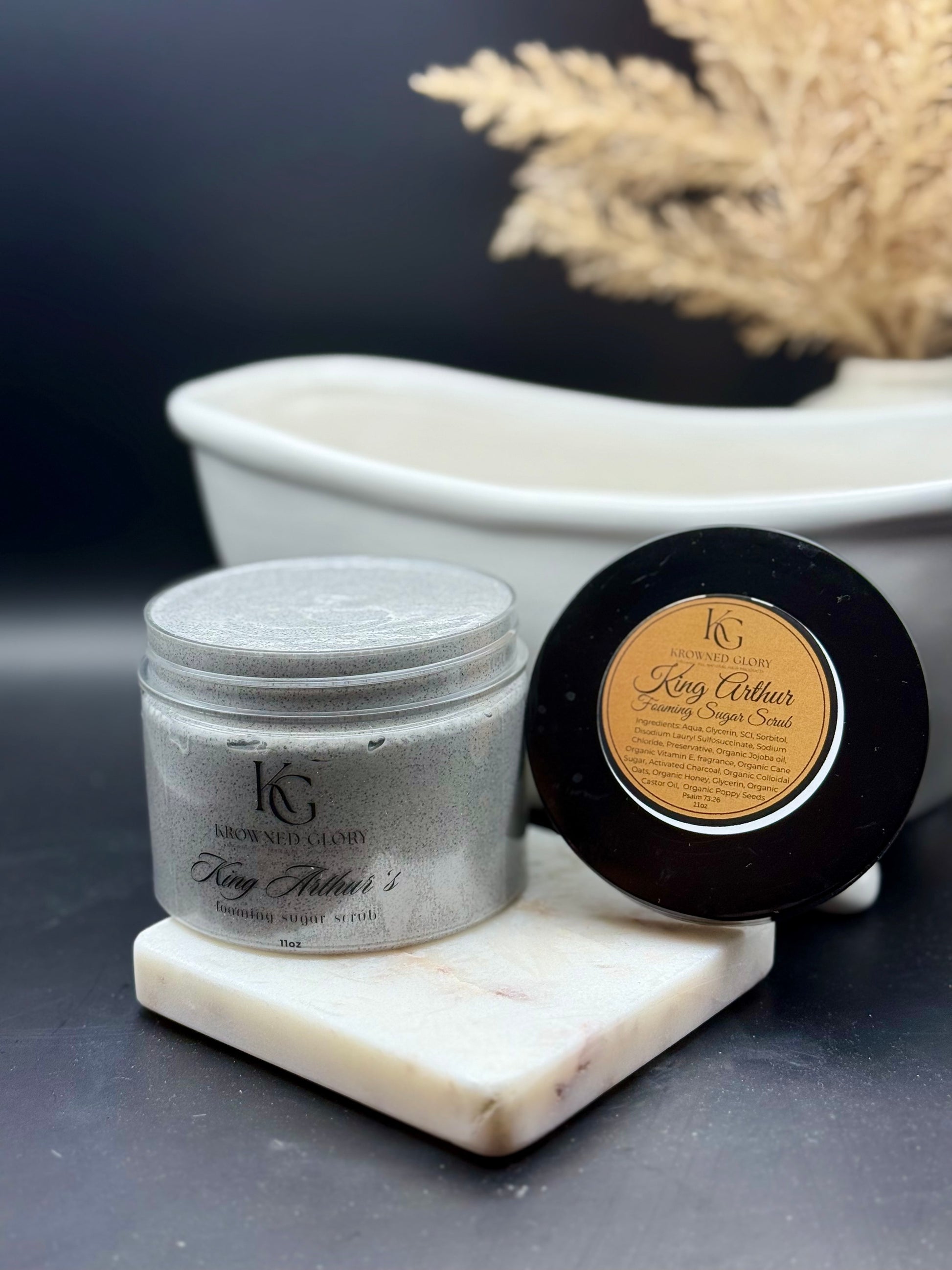 Command attention with skin that looks as legendary as your legacy. Our King Arthur’s Men Foaming Sugar Scrub is a bold, invigorating exfoliator created for the modern man who knows that greatness begins with self-care. Formulated with organic botanicals, detoxifying charcoal, and a clean, masculine scent, this scrub offers the perfect balance of strength and skin-loving sophistication.