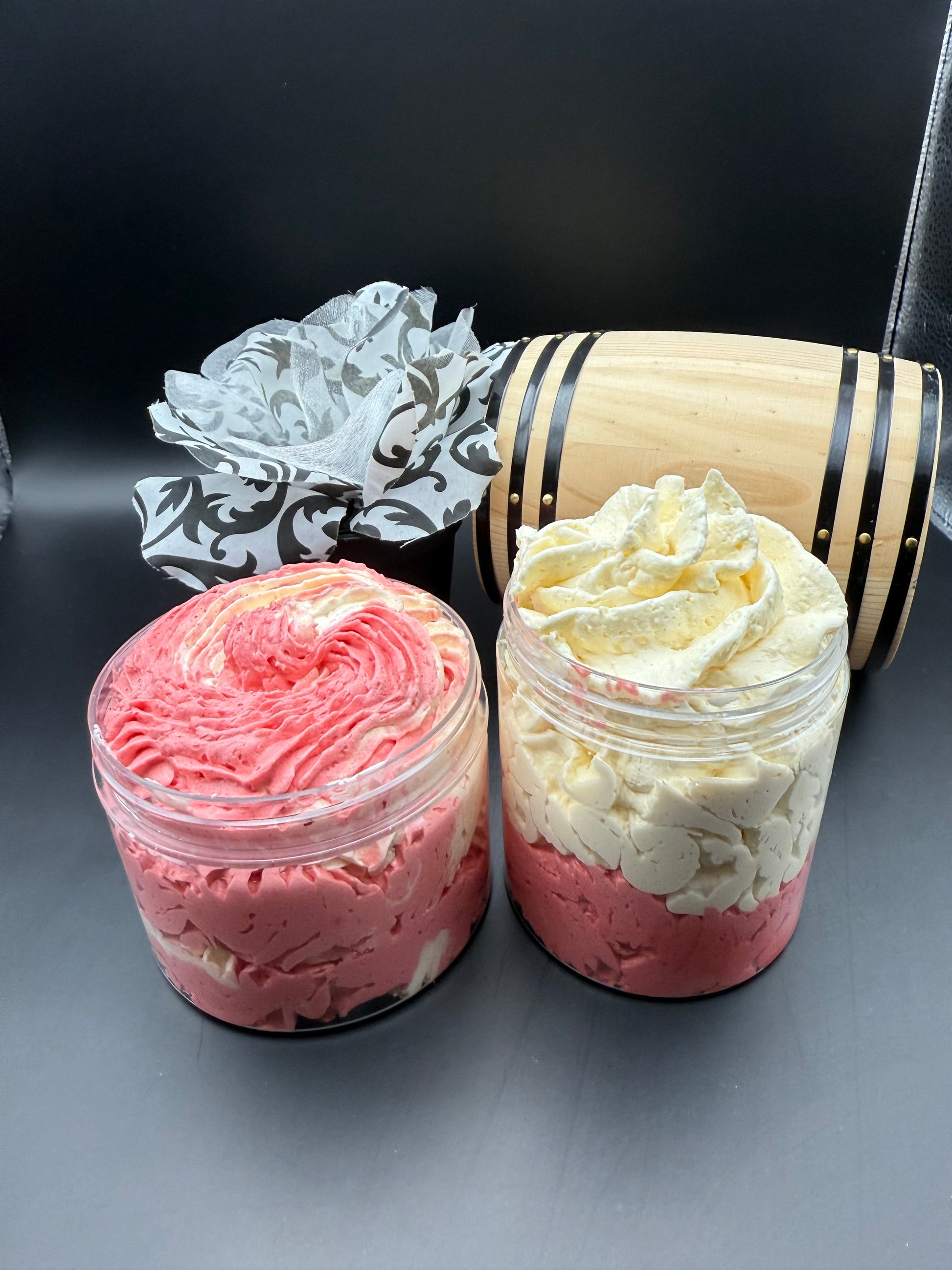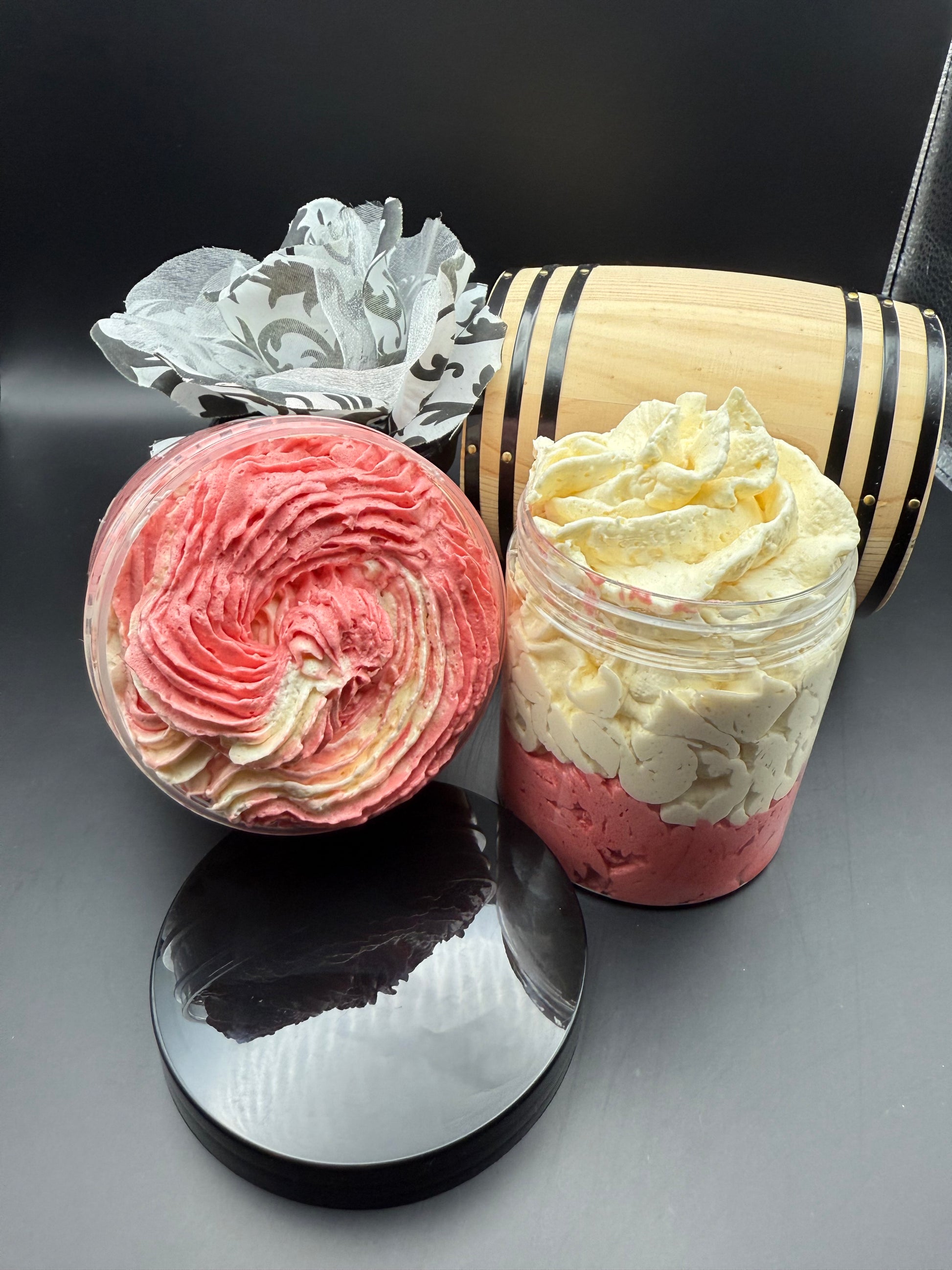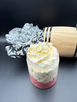 Ingredients: Mango Butter, Shea Butter, Kokum Butter, Cocoa Butter, Grapeseed oil, Apricot Seed Oil, Jojoba Oil, Coconut Oil, Vitamin E, Sea Buckthorn oil, Glycerin, Mica powder, Fragrance